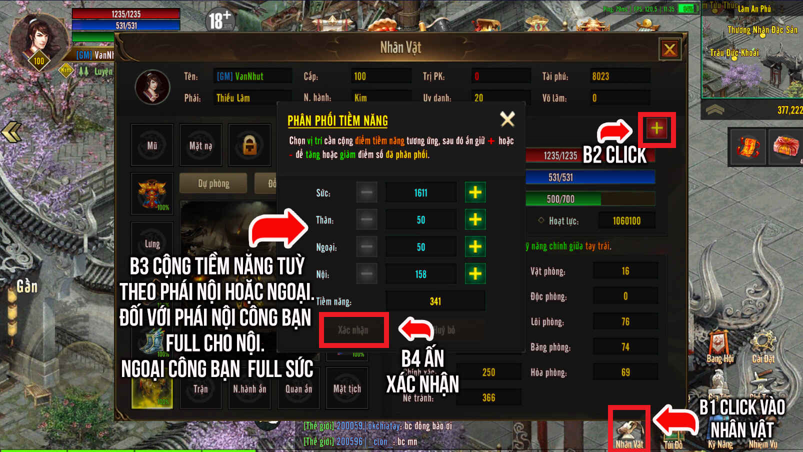 Cách Cộng Tiềm Năng : Đối với phái Nội Công bạn +full cho Nội. Ngoại Công bạn +full Sức . Đó là cách để tăng lực tay cao nhất. Còn lại bạn có thể tuỳ biến tỷ lệ sau cho hợp lý. Nếu cộng sai có thể tới Tẩy Tuỷ Đảo để tẩy lại tiềm năng.