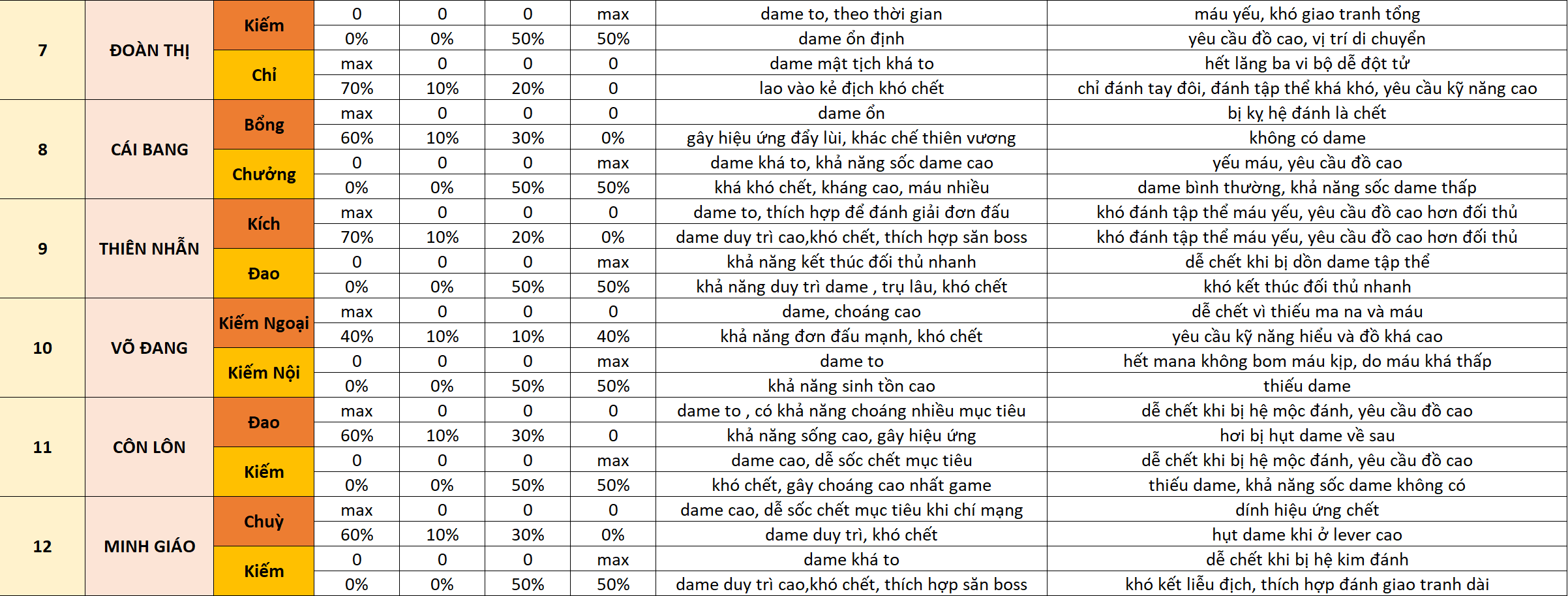 Bảng dưới mang tính chất tham khảo, tuỳ lối chơi và tình trạng trong game để cân đối riêng.