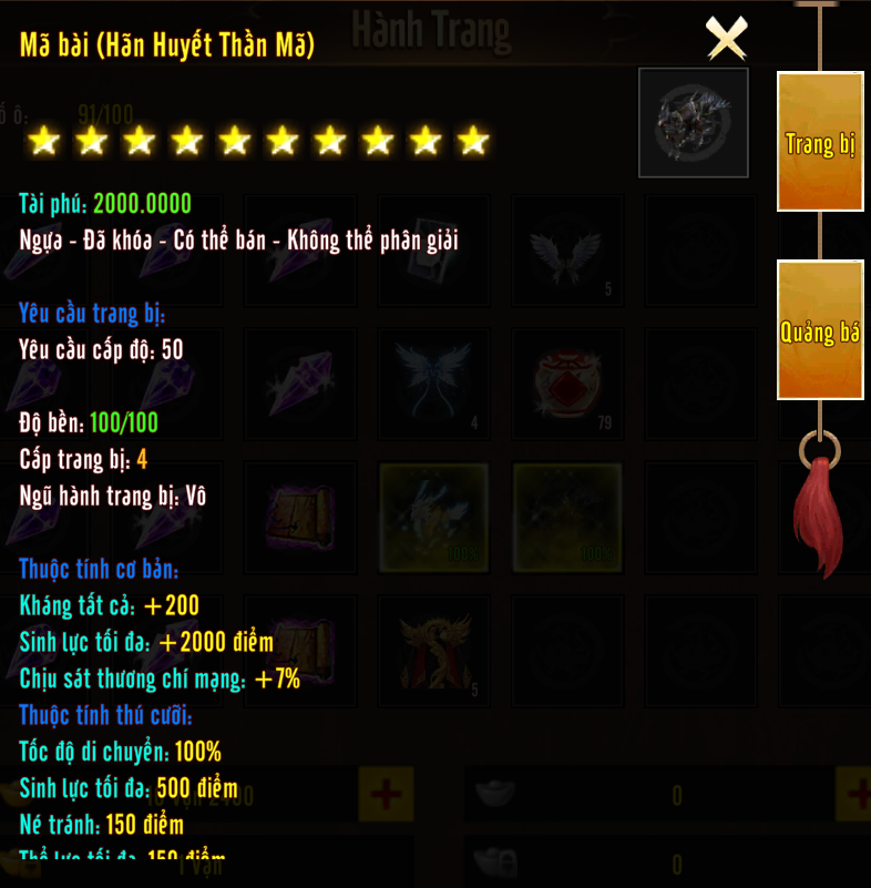 Danh Hiệu Nhất Đẳng Vương Gia (7 Ngày) [Thần Thú] Hãn Huyết Thần Mã (3 Ngày) (KTC +200) 10 000 Đồng Thường 20 000 Đồng Khoá 500 000 Bạc Thường 1 000 000 Bạc Khoá 50 000 000 EXP 100 Nguyệt Ảnh Thạch (Khoá) x1 Huyền Tinh 9 (Khoá) X2 Huyền Tinh 8 (Khoá) X3 Huyền Tinh 7 (Khoá)