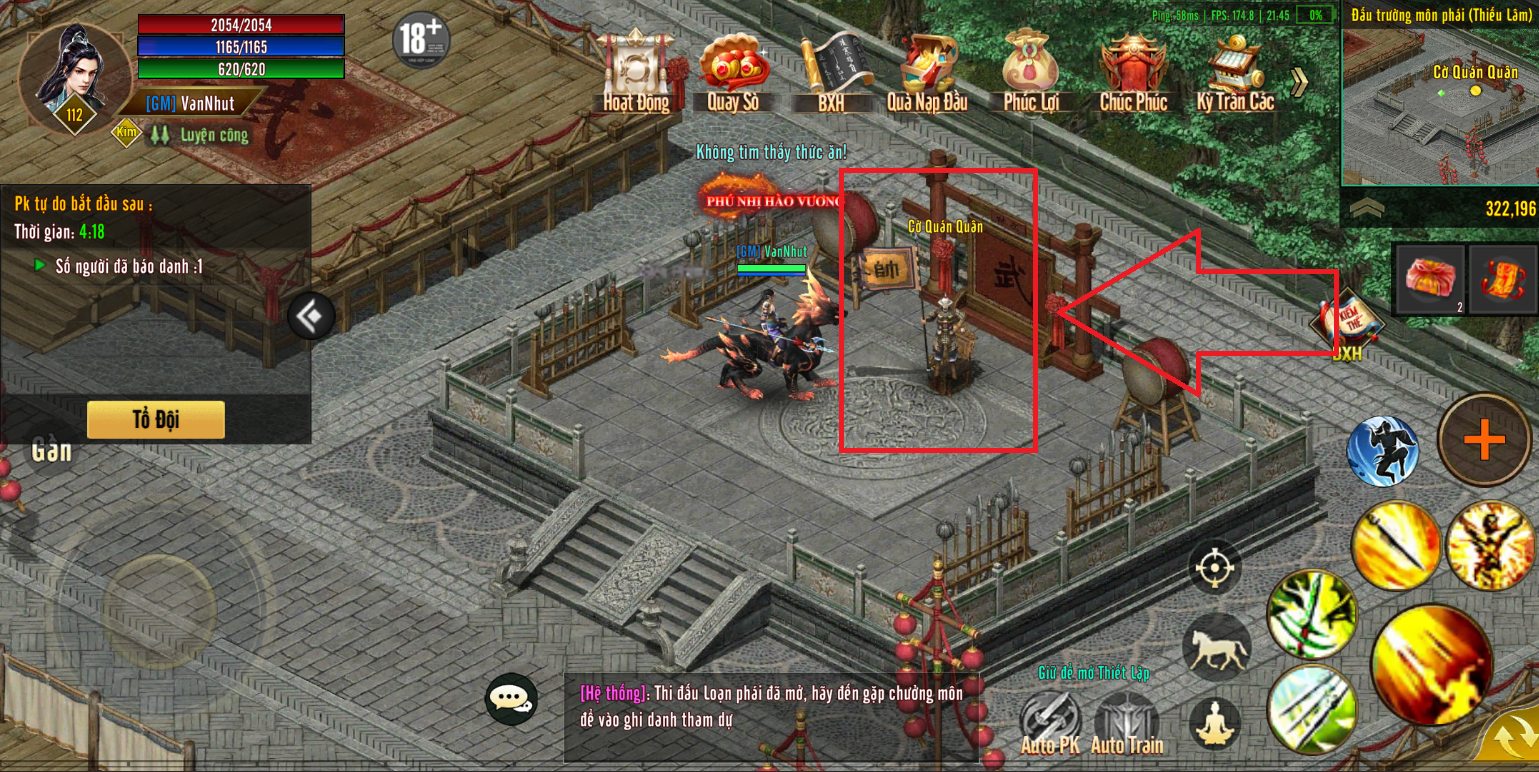 Đúng ngày và giờ quy định, về môn phái của mình, gặp NPC Chưởng Môn, chọn dòng đối thoại Hoạt động Thi Đấu Loạn Chiến, sau đó chọn Ta muốn đến đấu trường môn phái. Người tham gia sẽ được đưa vào bản đồ chờ.
